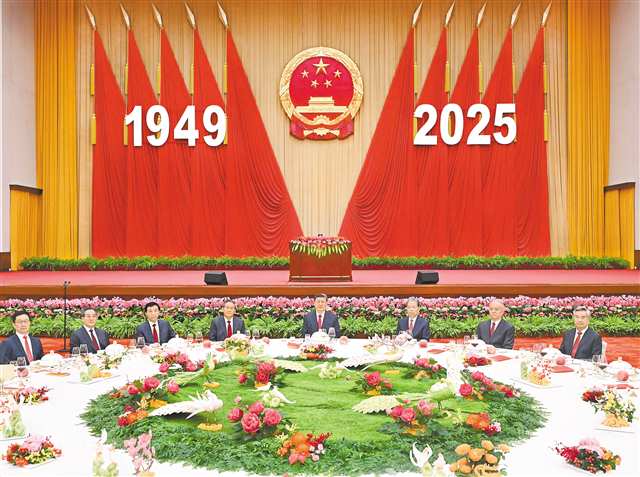 人民大会堂宴会厅华灯璀璨,洋溢着喜庆热烈的节日氛围。主席台上方高悬着庄严的国徽,“1949-2025”大字年号在鲜艳红旗映衬下格外醒目。