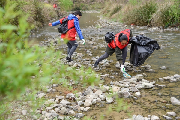 贵州省黔南州龙里县龙山镇组织党员干部开展清理河道水面漂浮物、障碍物,岸线垃圾及其他废弃物为主要内容的“清水清岸”环境整治活动,提高河道防洪排涝能力,恢复和维护河道生态系统。图为龙里县龙山镇党员干部在清理河道垃圾。(贵州省黔南州龙里县纪委监委供 罗显琴 摄)