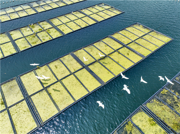 杭州市淳安县千岛湖镇坪山生态浮岛上,白鹭成群飞舞。为保护自然生态环境,当地在入湖口建设生态浮岛,利用水生植物生长过程中密集的根系吸收,增强上层水体的净化能力,进一步提升水质。(杭州市淳安县纪委监委供 谢航凯 摄)