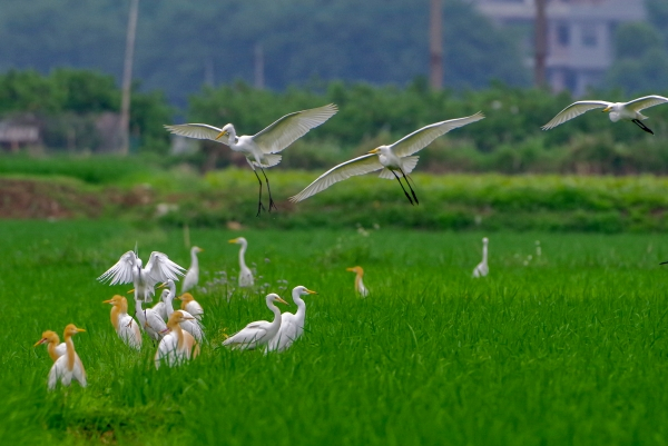 珍爱地球,守护家园。广西壮族自治区博白县始终致力于打造宜居宜业生态田园城市,在统筹推进山水林田湖综合治理的同时,开展植被恢复、野生动植物资源保护,吸引各种鸟类在此繁衍栖息。图为国家二级保护动物白鹭在该县南流江河畔嬉戏、觅食。(广西壮族自治区博白县纪委监委供 陈乔湘 摄)