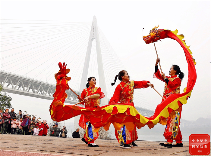 重庆市级非遗项目姜家舞龙在巴南区白居寺长江大桥展演,吸引不少市民群众前来打卡,感受传统文化中的年味。(重庆市巴南区纪委监委供 何龙飞 摄)