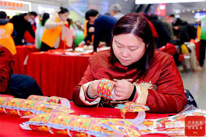 上海市闵行区新虹街道、铁路上海站在虹桥火车站联合举办“我们的节日•精神的家园”春节送福活动,非遗艺人用彰显中国传统文化的非遗伴手礼,为归家的旅客送上满满的节日祝福。图为非遗传承人为旅客现场制作纸龙灯。(上海市闵行区纪委监委供 欣洪悦 摄)