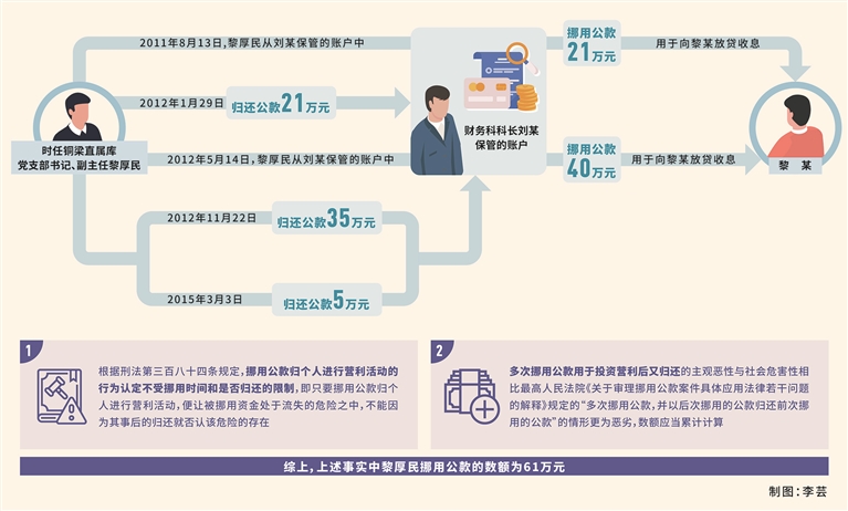 其中,2011年8月13日,黎厚民从刘某保管的账户中挪用公款21万元,用于向其亲戚黎某放贷收息。2012年1月29日,黎厚民归还公款21万元。2012年5月14日,黎厚民从刘某保管的账户中挪用公款40万元,用于向黎某放贷收息。2012年11月22日、2015年3月3日,黎厚民分别归还公款35万元、5万元。