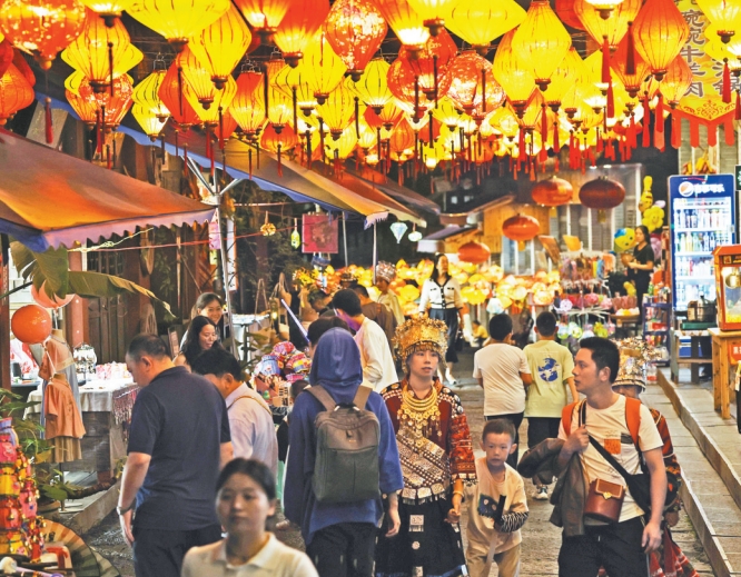 0月3日夜晚,彭水县蚩尤九黎城,璀璨的夜景扮靓了整座苗城,吸引了不少游客前来游览观光。