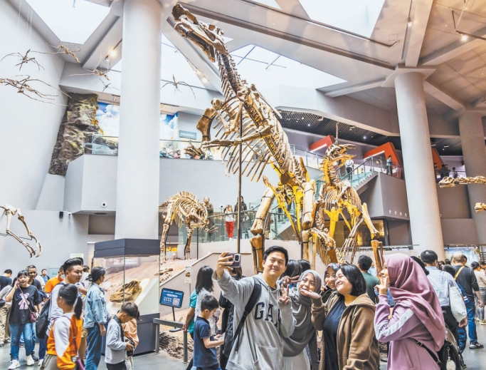10月3日,重庆自然博物馆,游客们在拍照留影。