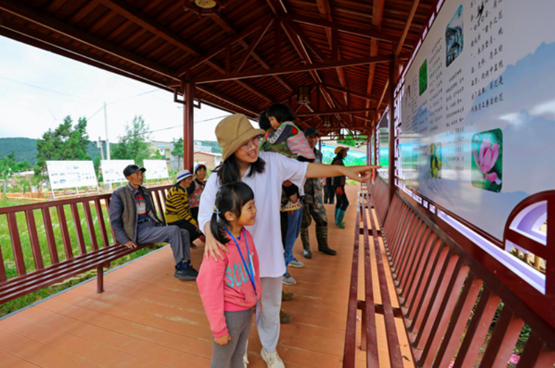 云南省陆良县纪委监委在深入推进“清廉村(居)”建设中,挖掘本地传统文化中的家风家训和乡贤廉吏故事,打造廉洁文化公园、家风家训廊亭、乡情村史展馆等教育阵地,在潜移默化中培育文明乡风、良好家风、淳朴民风。图为6月26日,在该县活水乡龙家水塘村,村民到新建成的“初心亭”里观看家风故事展。