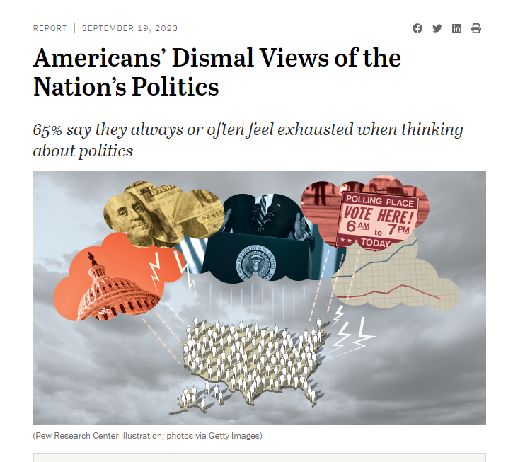 近三分之二的人(65%)表示,他们在思考政治时总是或经常感到疲惫,而55%的人感到愤怒。相比之下,只有10%的人说他们总是或经常对政治抱有希望。