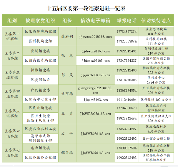 区委巡察组巡察期间,畅通信访反映渠道,明确专人负责接访,主要受理被巡察党组织领导班子及其成员和下一级党组织主要负责人问题的来信来电来访,重点是关于违反政治纪律、组织纪律、廉洁纪律、群众纪律和工作纪律等方面的举报和反映。其他不属于巡察受理的信访问题,将按规定移交相关部门处理。巡察组受理信访时间统一截止到2022年7月1日。