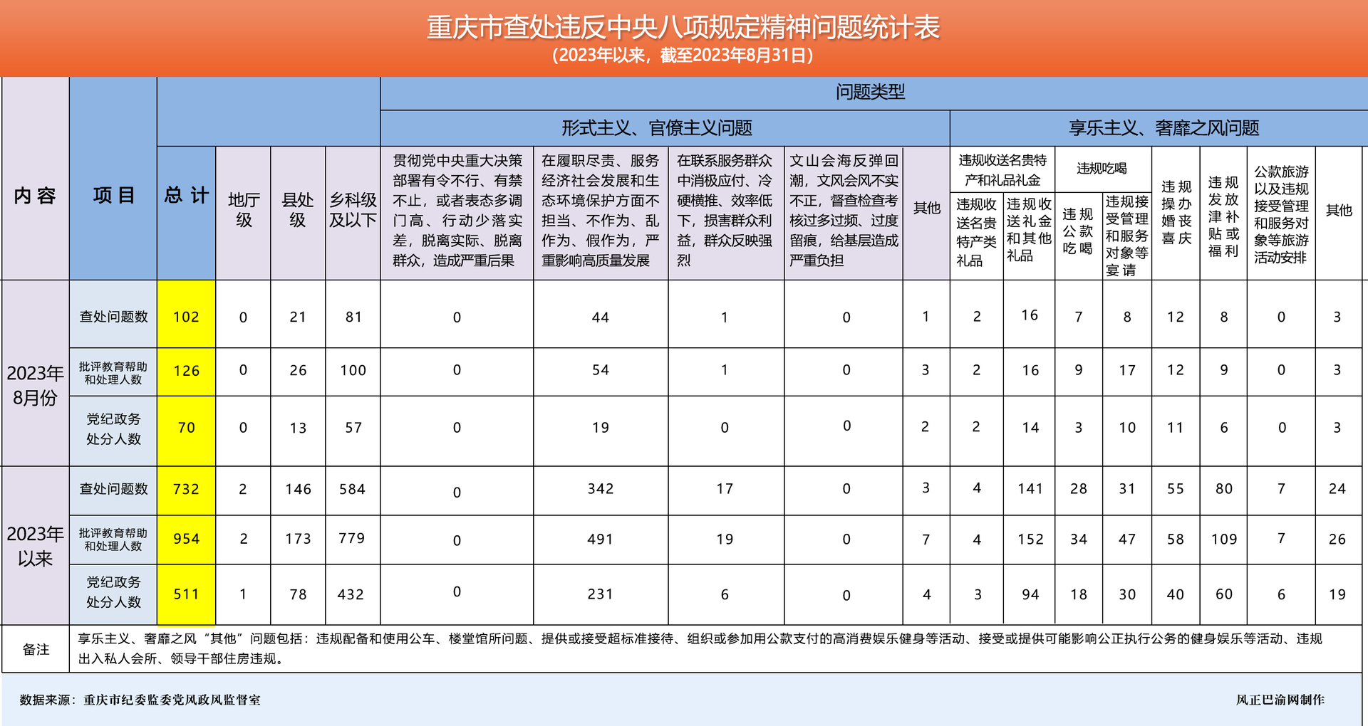 根据中央纪委国家监委要求,市纪委监委在全市纪检监察机关建立了查处违反中央八项规定精神问题月报制度。2023年以来,截至8月31日,全市查处违反中央八项规定精神问题情况如下: